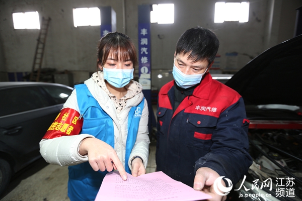 图为扬州一社区志愿者向企业员工倡导就地过年 董辉摄 “最近,疫情比较严重,为了降低病毒传染的可能性,也为了您和家人的健康,我们建议您就在扬州过年,等年后疫情平稳了再回家看看。”1月21日,在江苏扬州丰润汽修厂,石桥社区疫情防控志愿者吕琳向来扬务工人员赵从玖和他的工友们递上了《…
