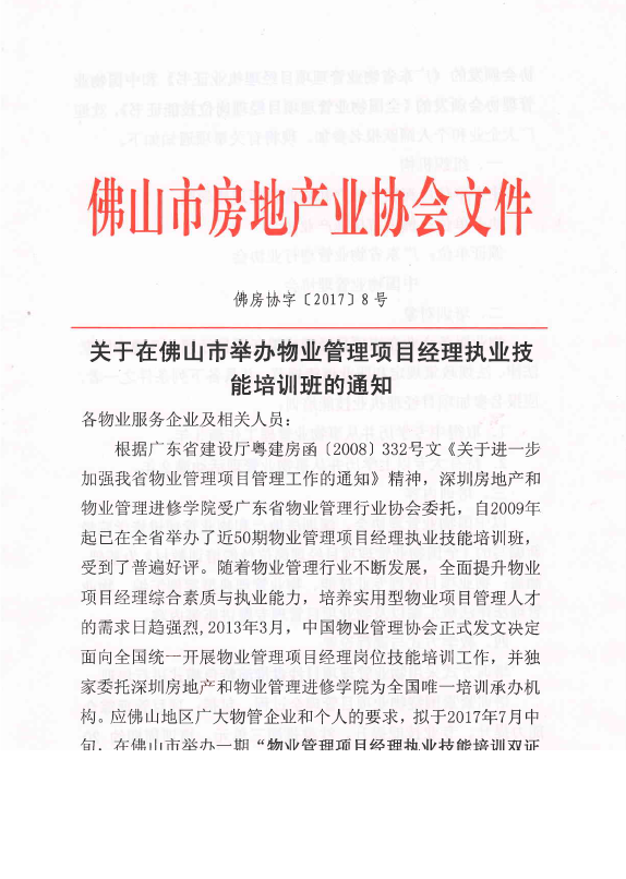 关于在佛山市举办物业管理项目经理执业技能培训班的通知272