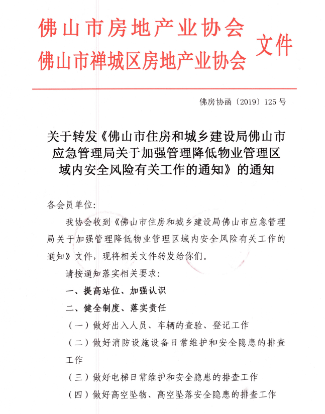 关于转发《佛山市住房和城乡建设局佛山市应急管理局关于加强管理降低物业管理区域内安全风险有关工作的通知》的通知181