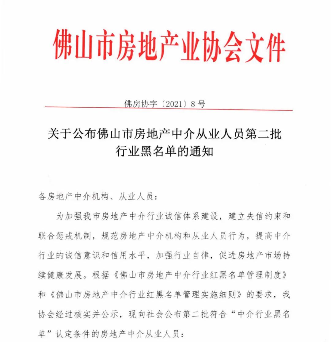 关于公布佛山市房地产中介从业人员第二批行业黑名单的通知86