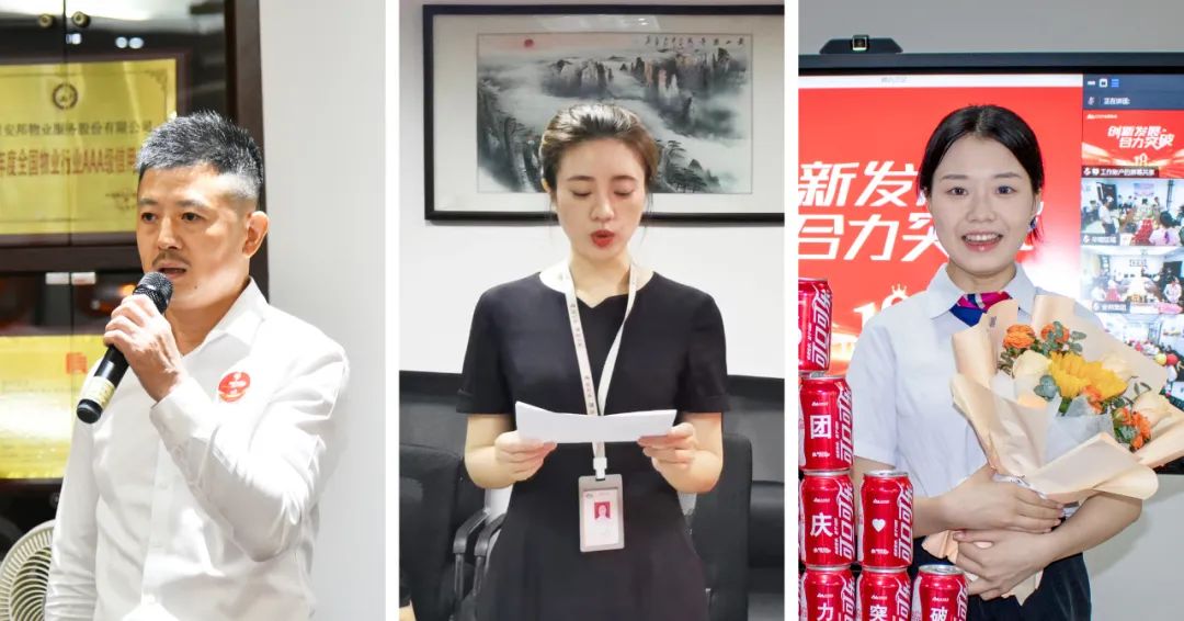 祝福视频播放结束后,来自君地商务广场项目经理杨天华、重庆分公司计划财务部李琴、璀璨广场项目客服管家成琳三名员工代表分别发言并致以安邦美好的祝福。