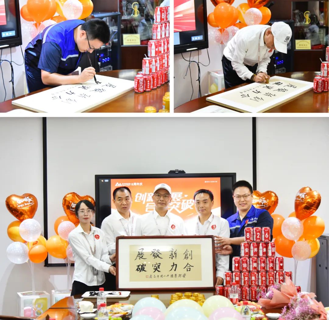 在大家分享蛋糕的同时,4位入职同事和寿星分别挥毫泼墨,共同书写“创新发展,合力突破”,感受安邦深厚底蕴的企业文化魅力。周董亲自为题词落印。