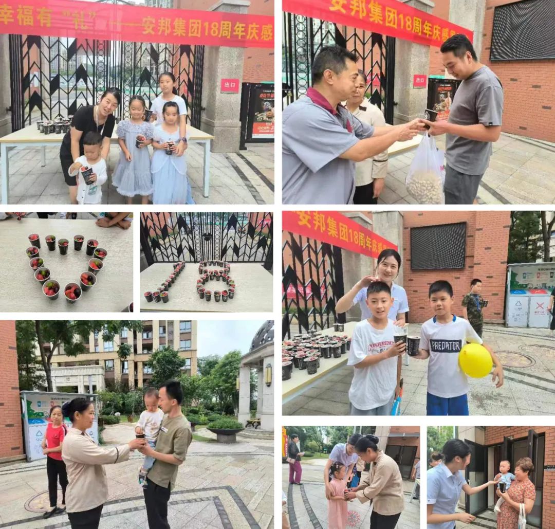 为答谢客户一直以来对安邦物业的支持、理解与配合,司庆期间,安邦物业组织开展了“美好相伴,幸福有‘礼’”18周年司庆感恩回馈活动,各住宅项目积极组织开展便民服务和亲子互动活动。